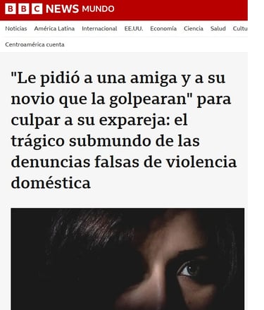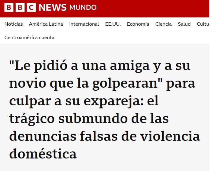 El artículo de BBC Mundo, ilustrado en la imagen, profundiza en el fenómeno internacional de las denuncias falsas de violencia doméstica y el “submundo trágico” que generan estas prácticas, especialmente contra hombres. El reportaje documenta casos donde, motivados por venganza o intereses personales en procesos de divorcio o custodia, algunas personas manipulan evidencia o incluso simulan agresiones para responsabilizar a sus exparejas.